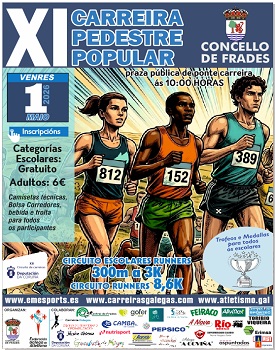 Mayo, 2026 01Mayo10:00202600:00XI CARREIRA PEDESTRE POPULAR- CONCELLO DE FRADES Hora(Viernes) 10:00 - 00:00