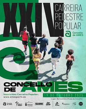 Octubre, 2025 19Octubre10:00202515:00XXIV CARREIRA PEDESTRE POPULAR CONCELLO DE AMES 2025 Hora(Domingo) 10:00 - 15:00